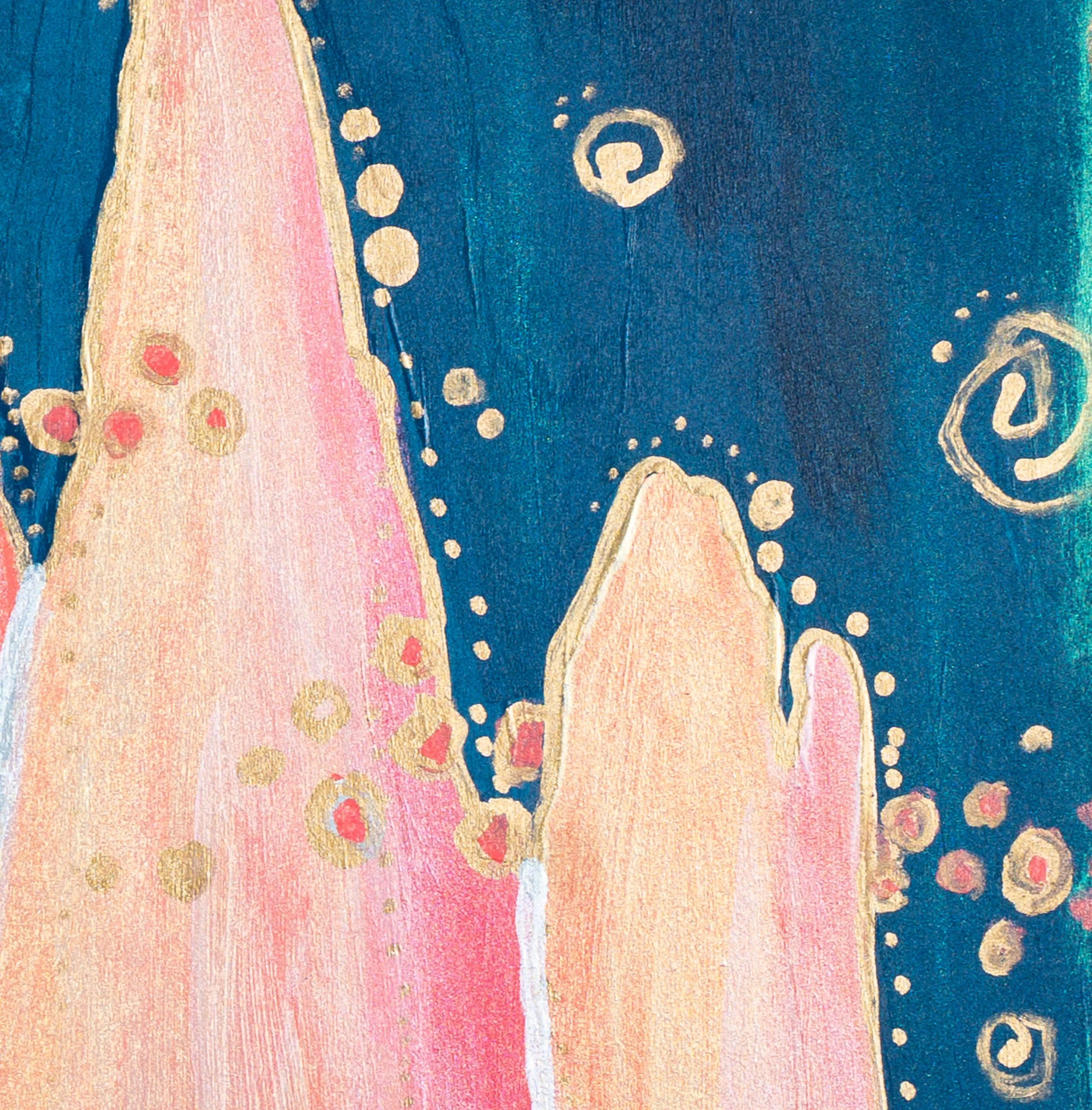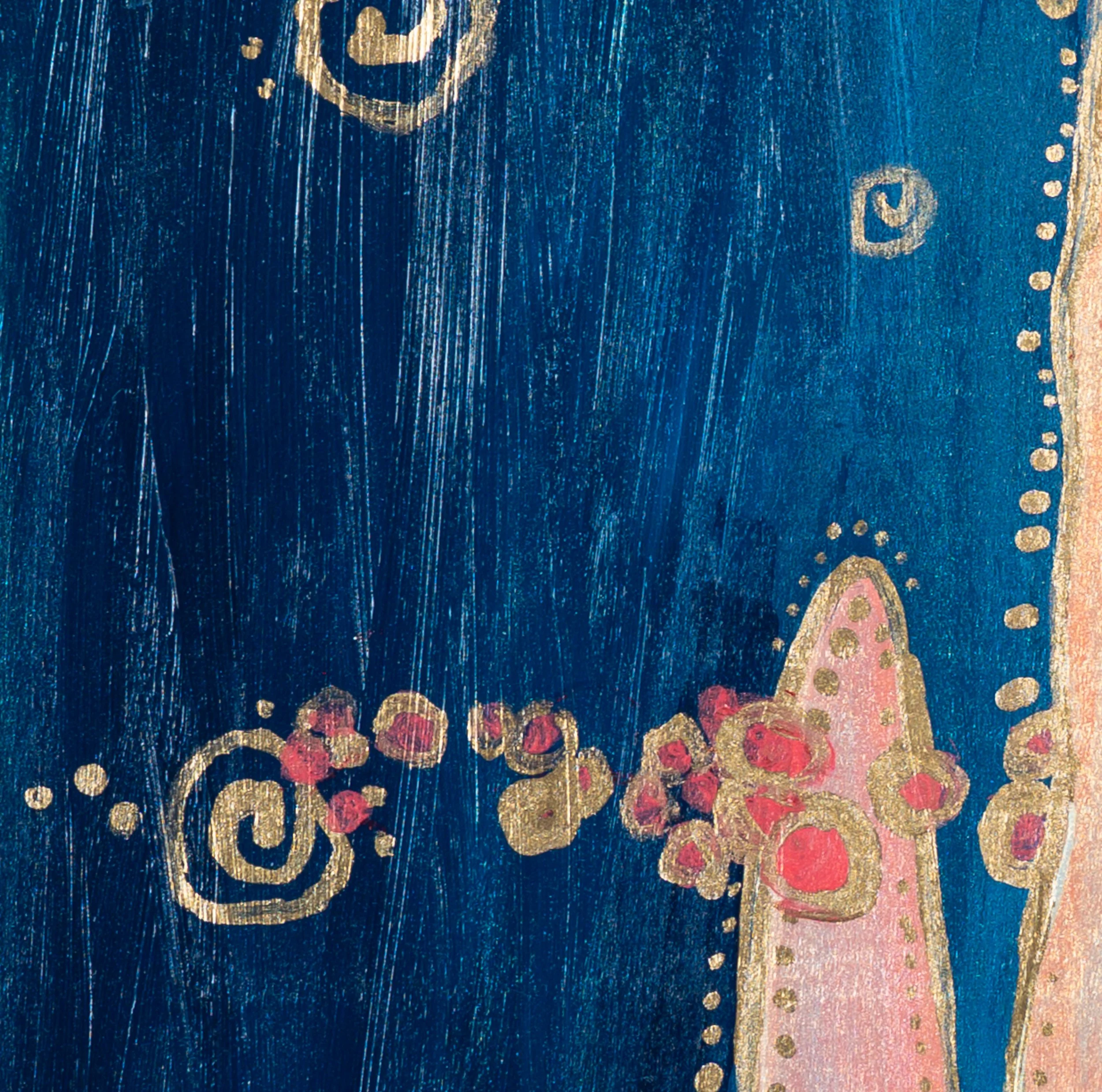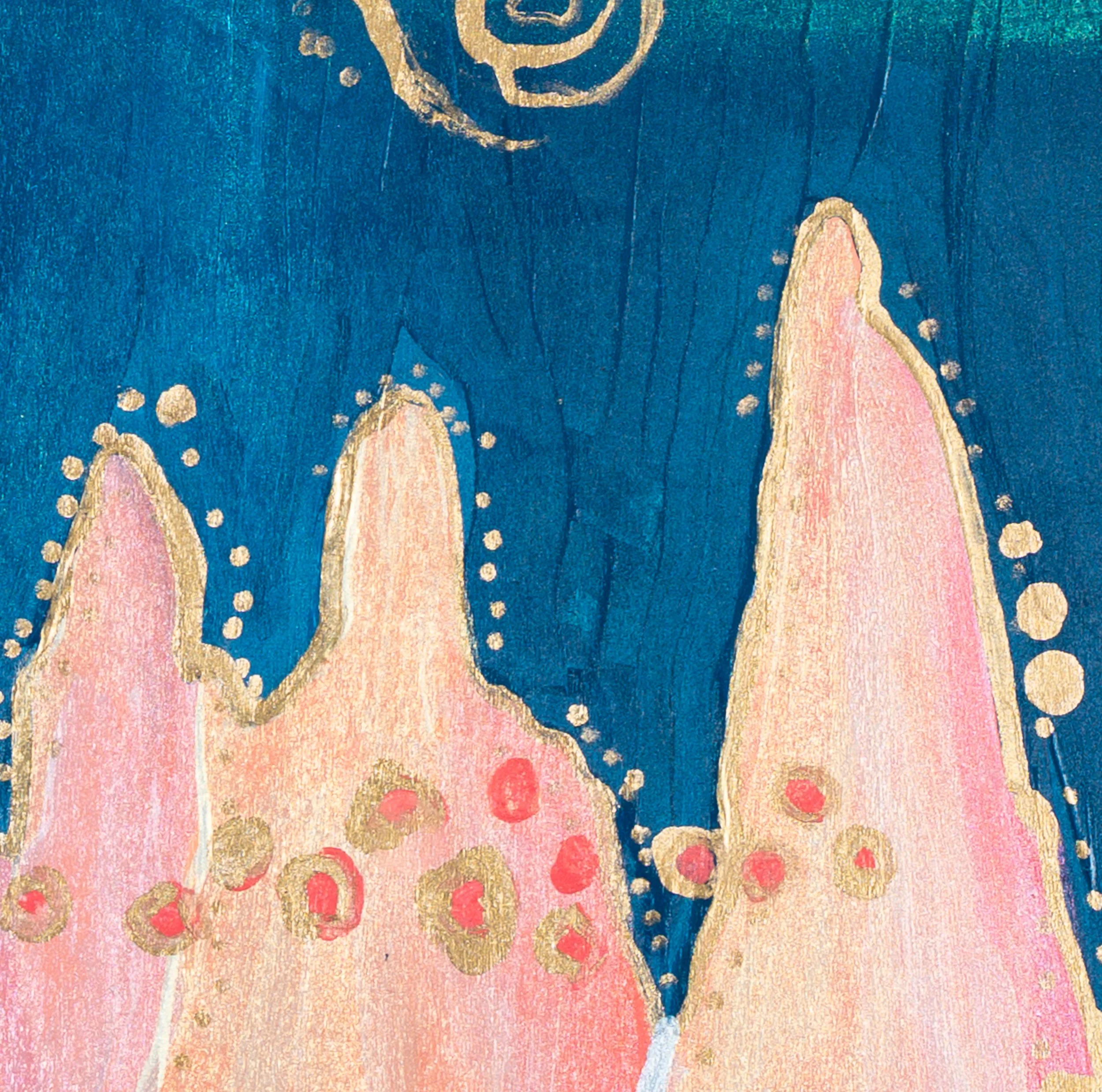 Accented with gold and iridescent paint that shifts with the light.